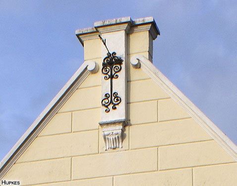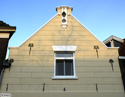 "Fragment (XVII, gepleisterd) van een topgevel, met toppilaster op kraagsteen. Lelievormig haakanker, en vier sierankers."